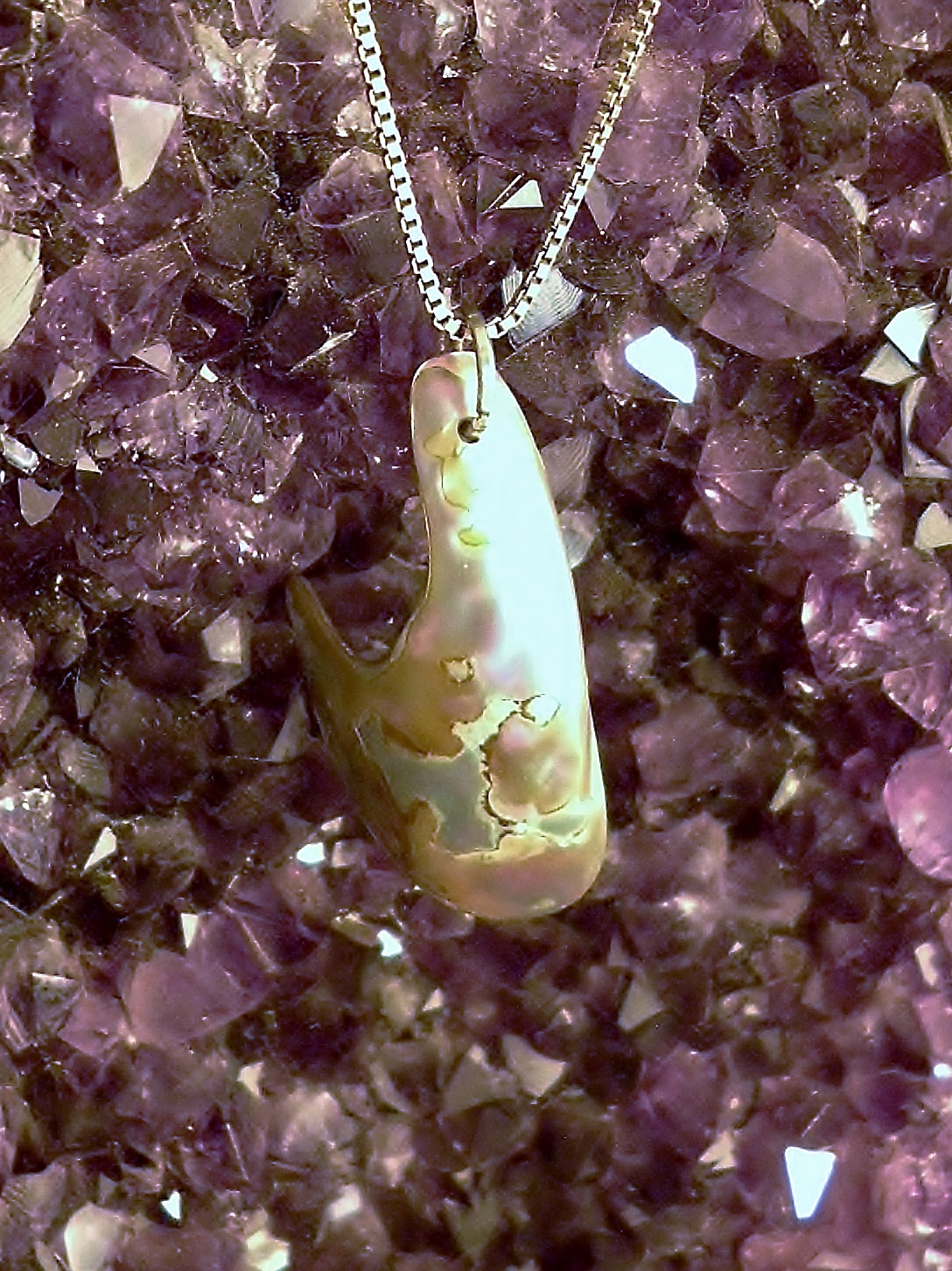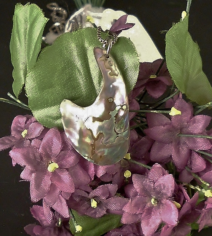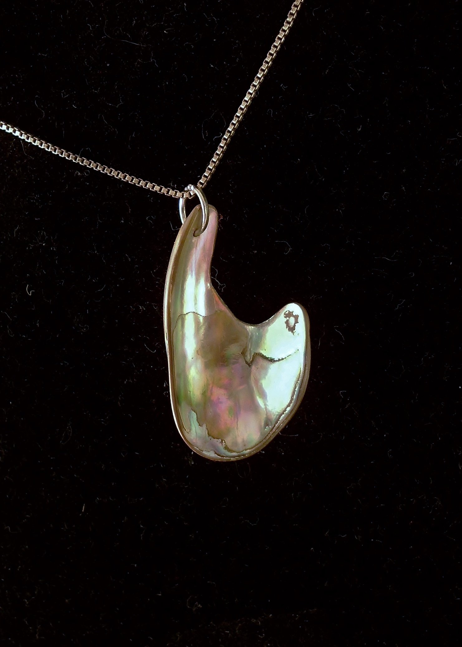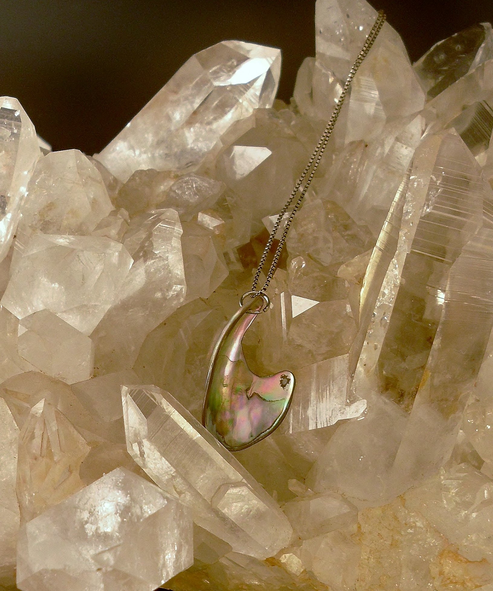 I LOVE abalone! I think it is one of the most colorful and mesmerizing of all shells. This dainty little polished freeform piece hangs off a delicate sterling silver chain and is very light yet eye-catching with iridescent pink, blue, green, silver, and gray running throughout. Both sides are polished to a high sheen.