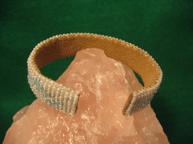This beautiful baby blue and white, shiny, peyote stitched seed bead bracelet has a leather back with an adjustable aluminum blank inside. This OOAK piece took so long that I decided not to continue with this particular modality of artwork. So this is, for sure, a one of a kind piece for me. Due to the aluminum, this beaded bracelet absolutely shimmers and shines!