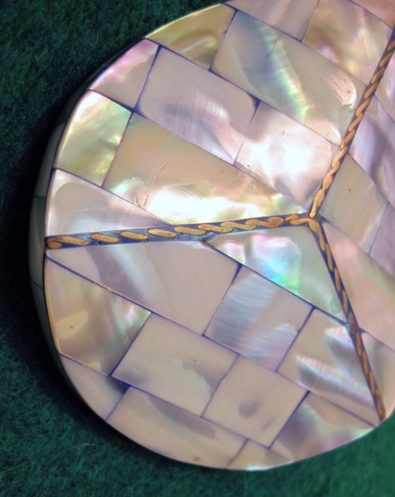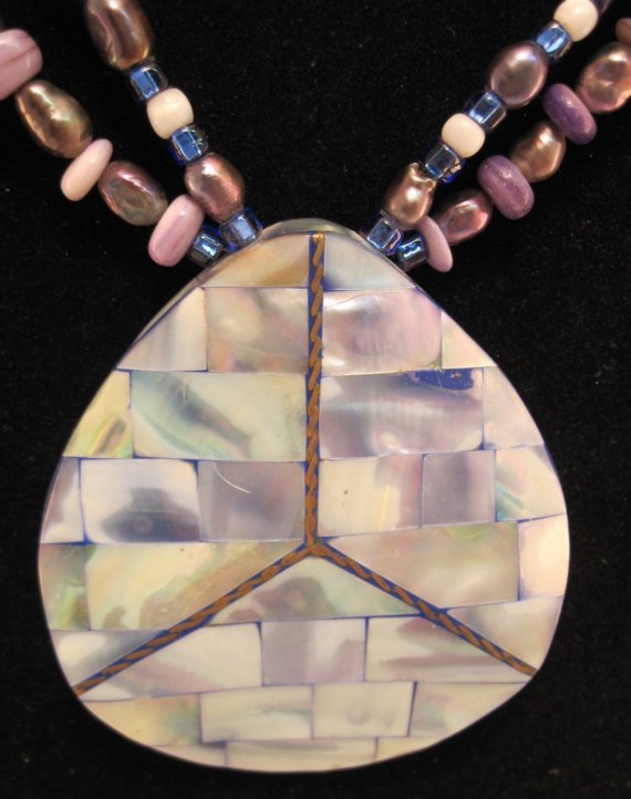 The entire necklace is approximately 21 ½” long and the pendant is around 4”X 5” inches. It is made of mosaic Mother of Pearl pieces along the sides as well as front and is inlayed with flattened brass twisted wire in a peace sign. It has a highly polished finish which made for some hard photographing, reflections suck, lol!