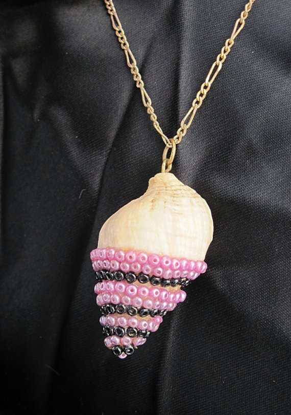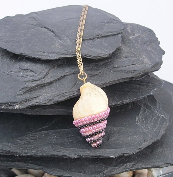 Purple, Pink, and Black Bead Encrusted Sea Shell Necklace