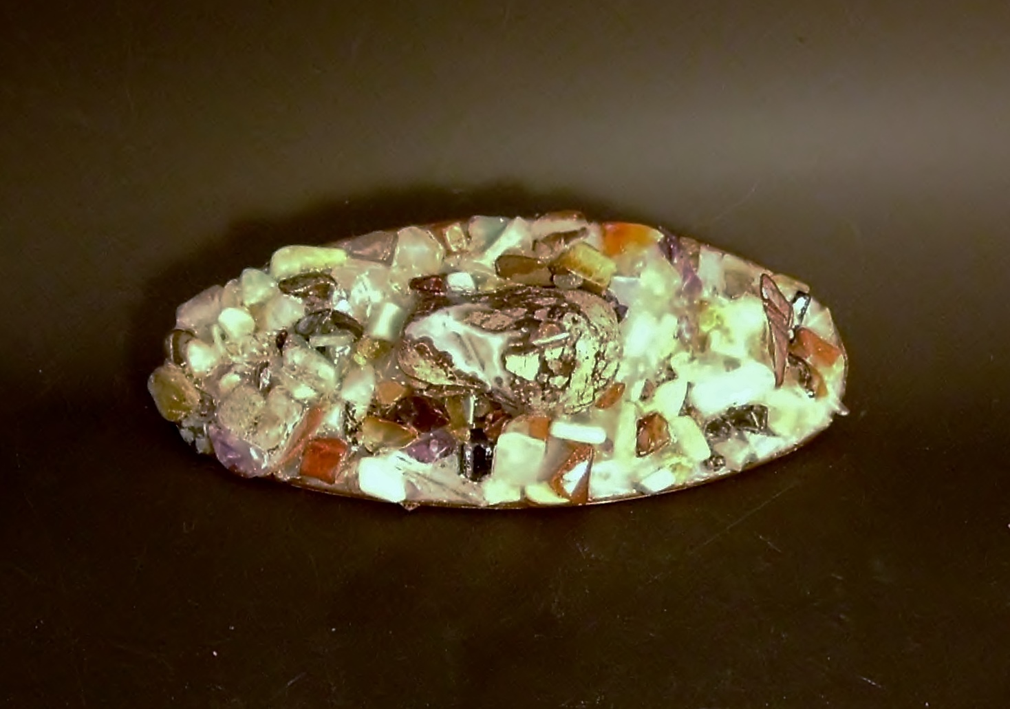 This lovely large hair clip is made with an authentic piece of geode with quartz that is surrounded by genuine gravel made of agate, quartz, jasper, aventurine, amethyst,tiger eye with a copper covered edge. It is oval and measures approximately 4 1/2" X 2" with a 3" clip. It may appear heavy but this clip is very strong and holds just fine!