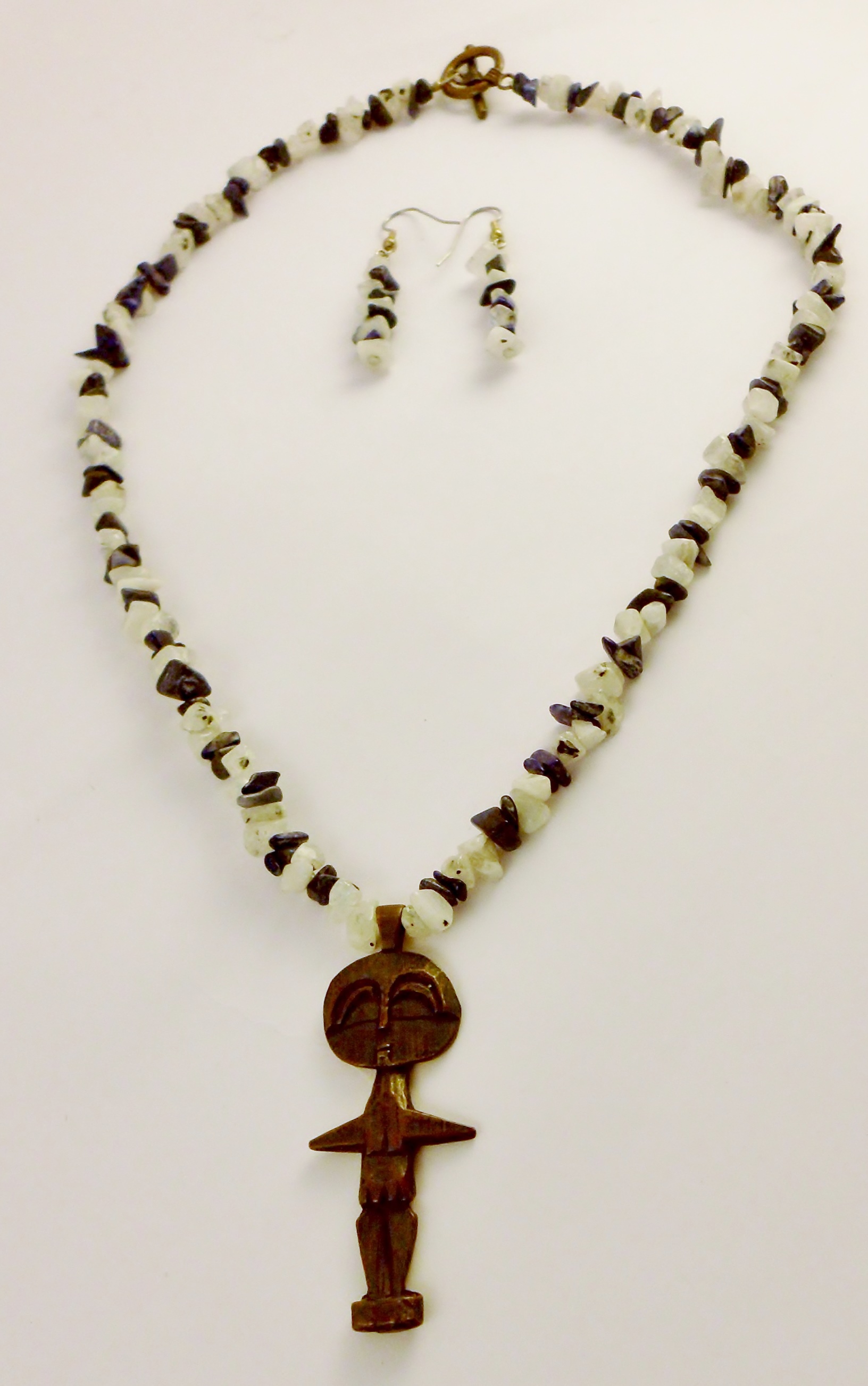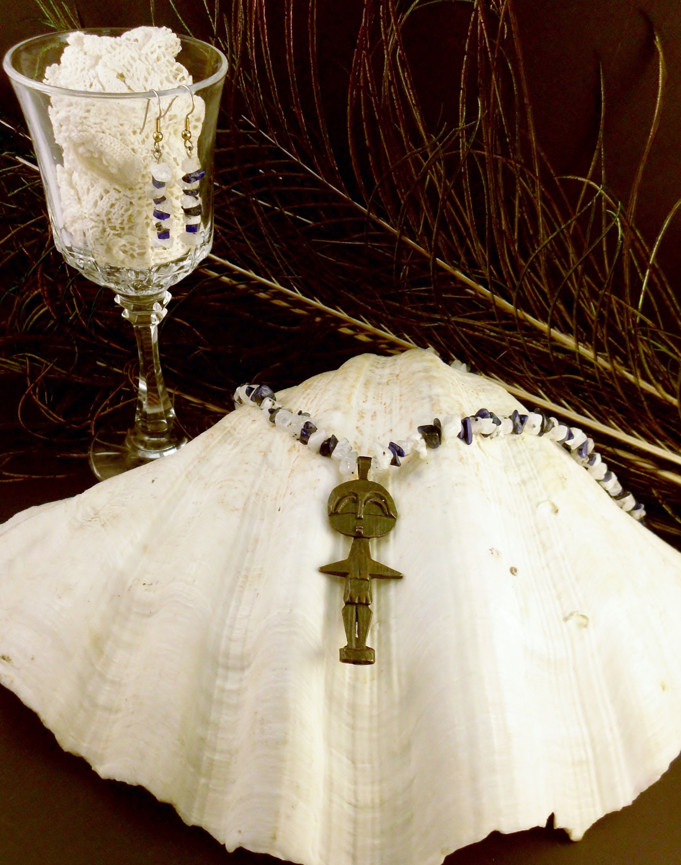 I made this beautiful one of a kind necklace and earring set is made with Rainbow Moonstone, Lapis Lazuli, and a unique bronze colored Tribal Figurine pendant.