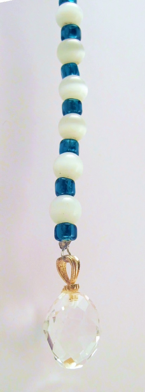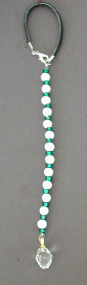 These Mother of Pearl beads are set off wonderfully by the sparkly green glass beads. The end is completed with a beautiful flashing little faceted Swarovski leaded crystal drop. It is all hung off of a leather cord that goes behind your mirror around the post and it closes securely with a lobster claw clasp.