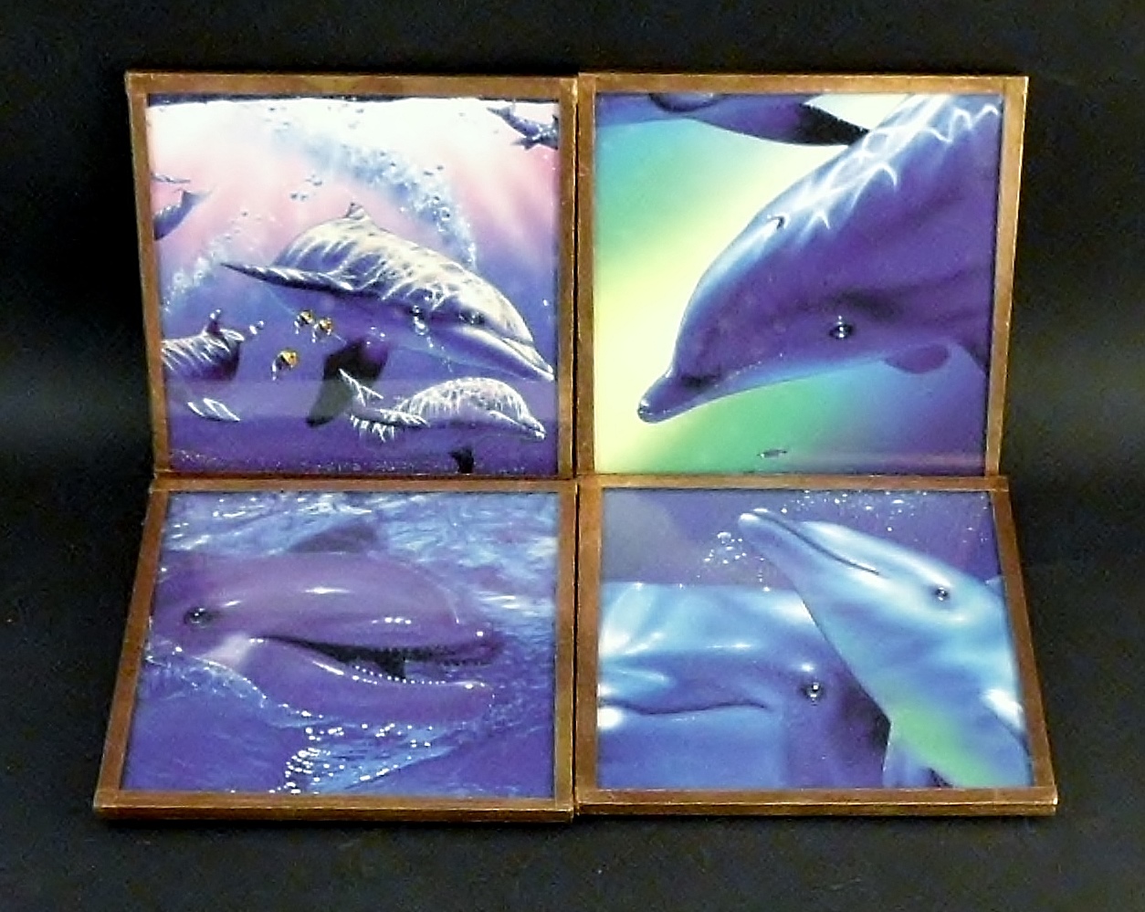 This is a set of four coasters made with images from a recycled calendar, they always have the best photography and why throw them out! They are images of four different dolphins. These coasters are 4" square and are made from glass & copper and have little rubber feet at each corner.