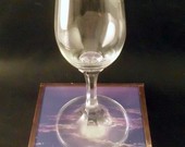 These coasters are 4" square, made from copper, glass, paper images, and have little rubber feet at each corner.