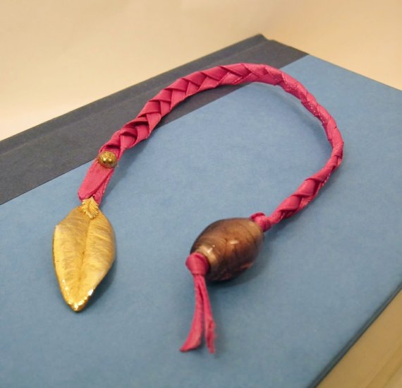 Pink Braided Ribbon Bookmark w/Gold Dipped Leaf