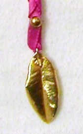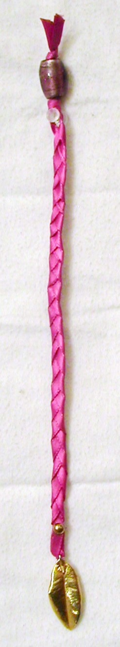 I made this beautiful pink braided ribbon while on a camping trip, my idea of fun on vacation! The gold dipped leaf is vintage dating back, I believe, to the 1970's with a real leaf inside! It is hooked on with a jump ring and securely glued and riveted to the end. The other end has a large purple glass bead knocked onto it.