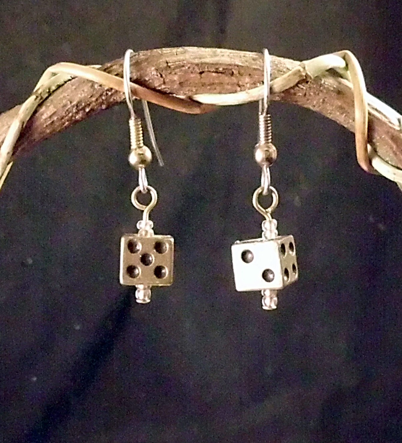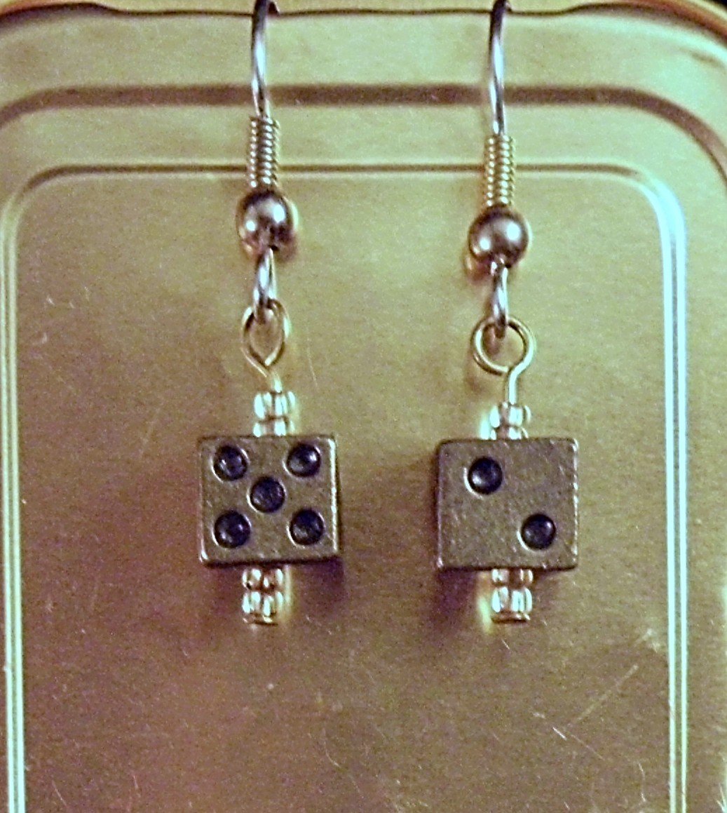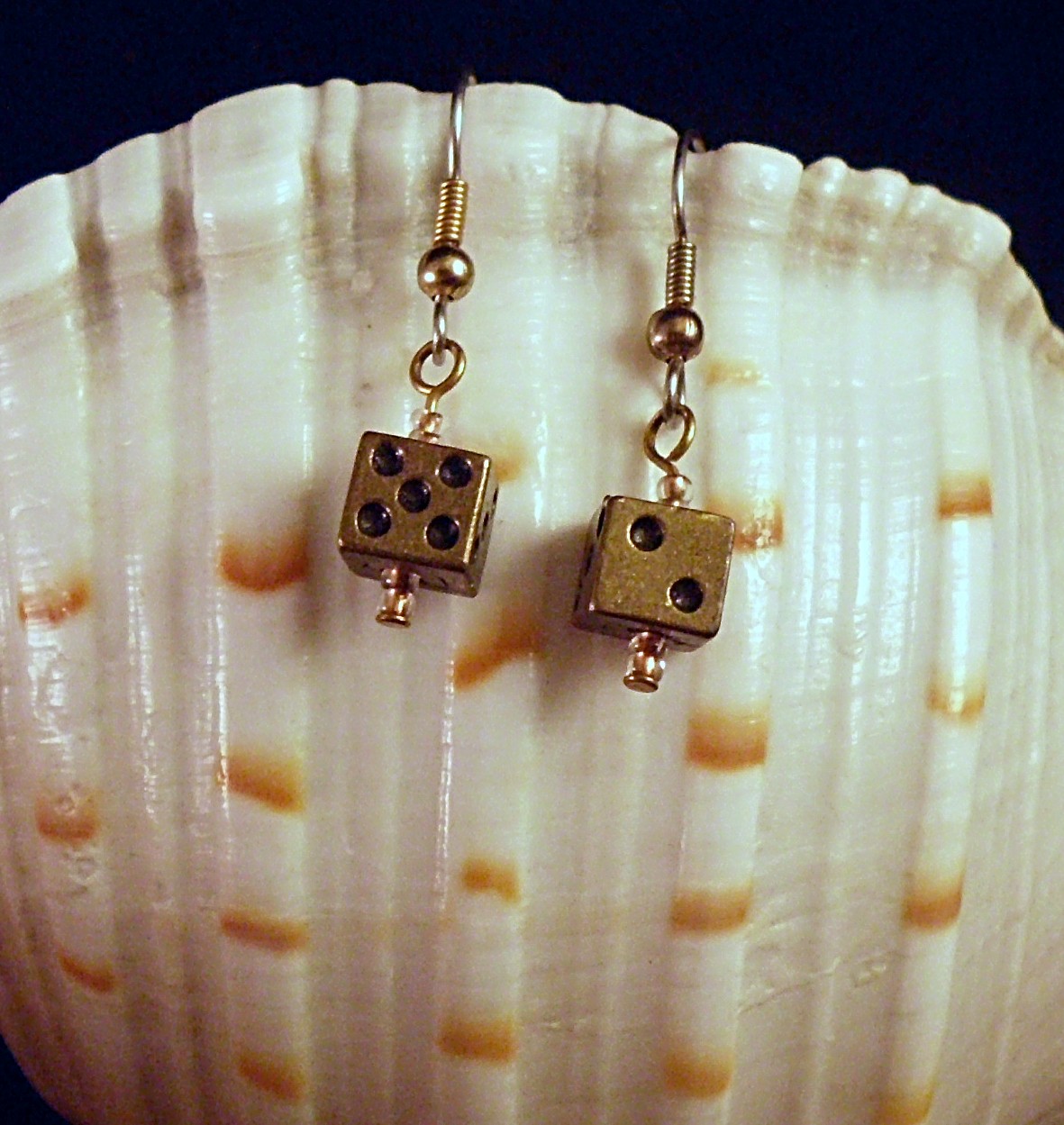 These unusual earrings are perfect for that gambler or game player in your life! These great little brass colored dice are alot of fun and are another OOAK addition for anyone's jewelry collection! Hung off of Sterling Silver French hooks these adorable earrings are sure to put a smile on any girls face!