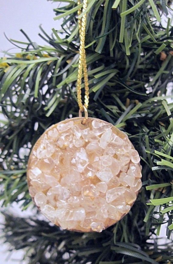 This beautiful Quartz Rock Crystal pendant is approximately 1 3/8” across and has a wonderful tumbled quartz crystal point outlined with quartz gravel on the front! The back side is encrusted with quartz rock crystal gravel. The underlying medal disc is gold toned and is attached to an 18” gold tone serpentine chain.