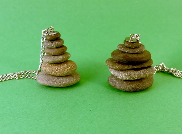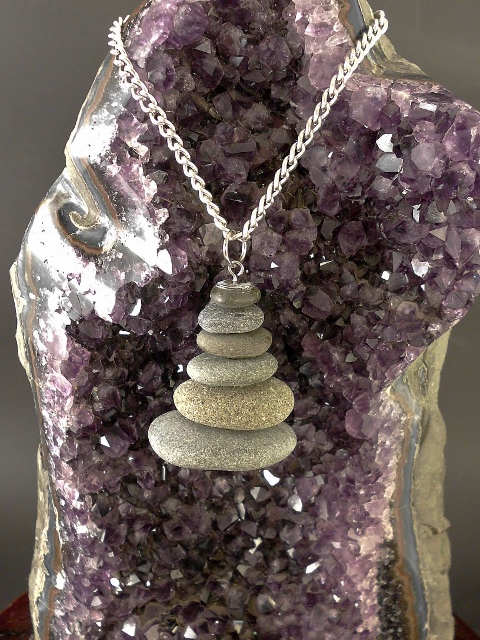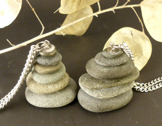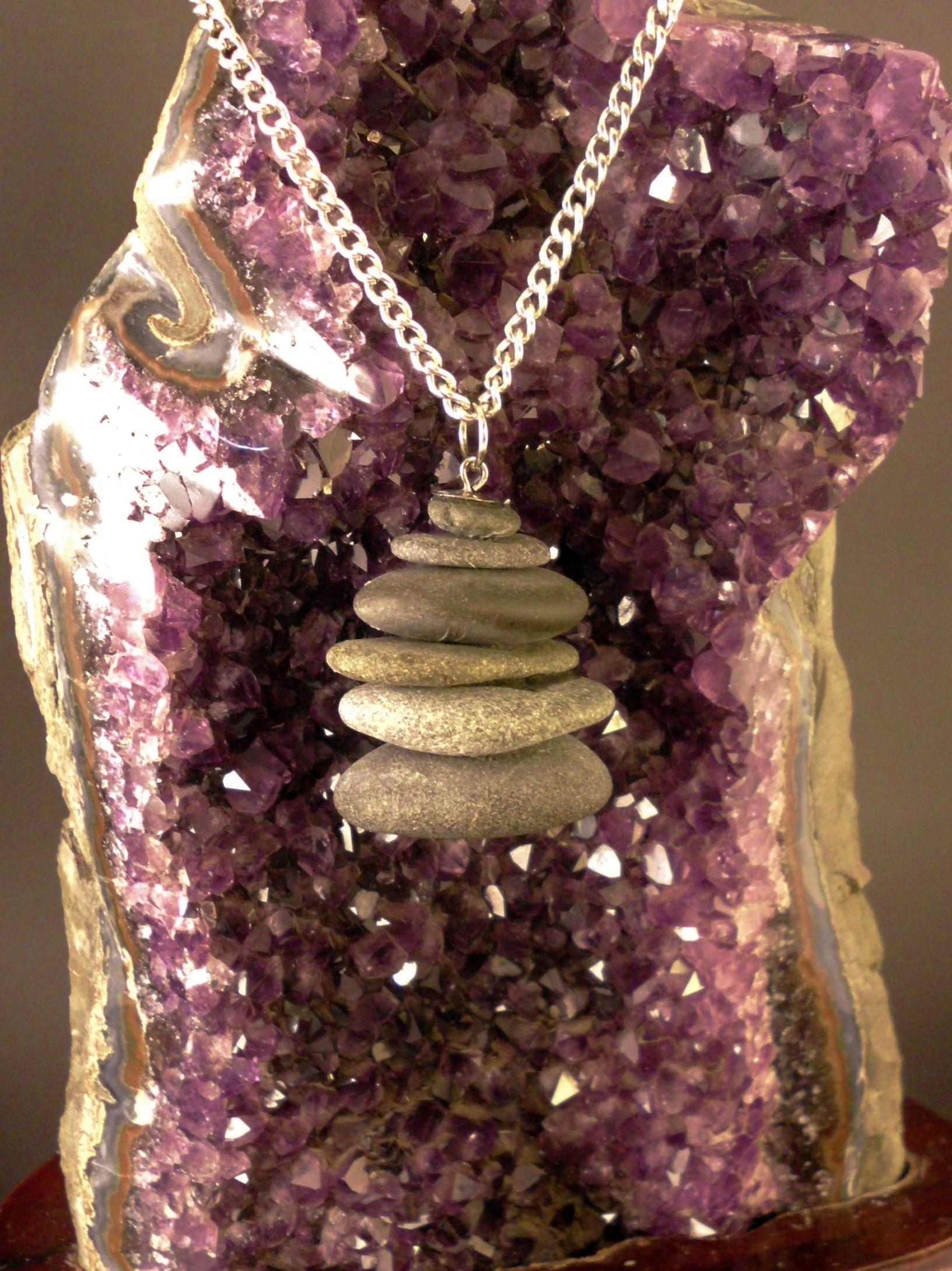 These unique stone Cairn pendants are approximately 1 1/2” X 1 3/4" and are made from basalt stones I collected off of a beach in Kalaloch, WA. For only $18 you get to pick one of these little beauties as you own!! I built / balanced these cairns with out glue before securely attaching them together and hanging them off 24" silver tone base metal chains.