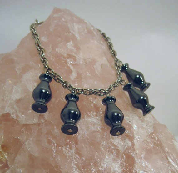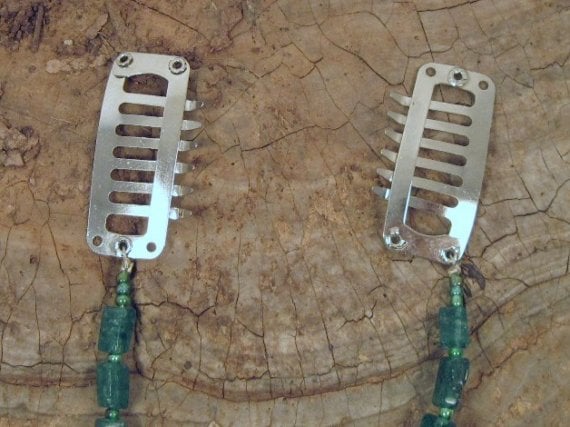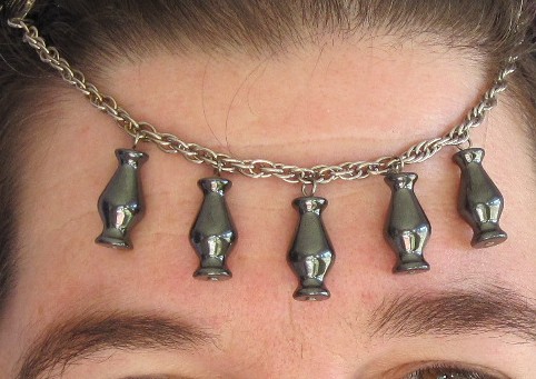 I put this piece together using repurposed silver chain and hematite beads, not sure what this shape is called, lol! The ends are finished with barrette style hair comb clips, used to use alligator clips, these are much better! As you can see from the picture, this is intended to be worn clipped into the hair on either side of your forehead to simulate a full circlet. Works for any costume for a Ren faire, SCA event, pagan gathering, Halloween, or just wear it to the grocery store!