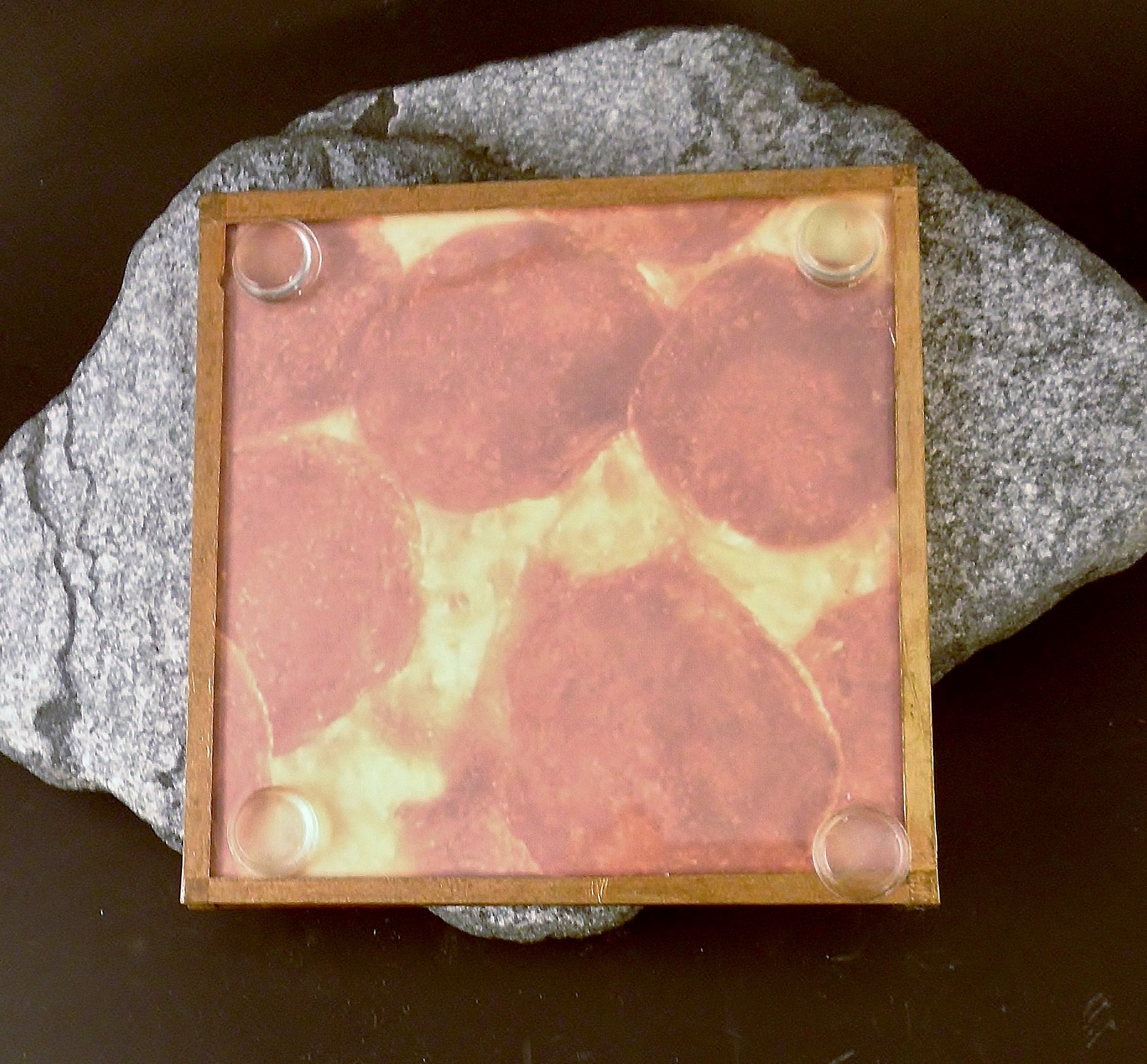 These coasters are 4" square, made from copper, glass, paper images, and have little rubber feet at each corner.
