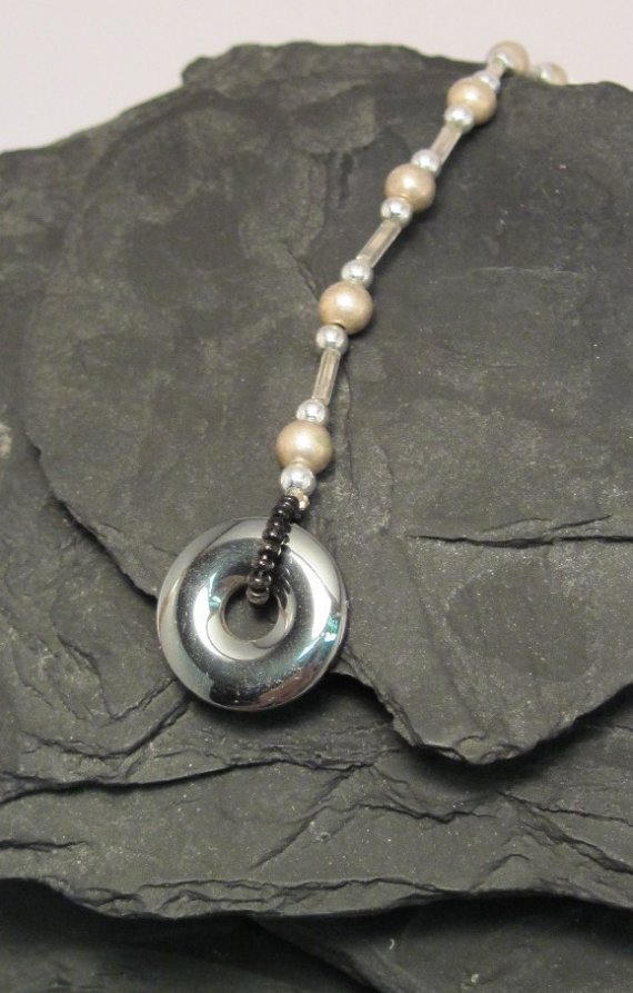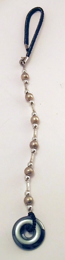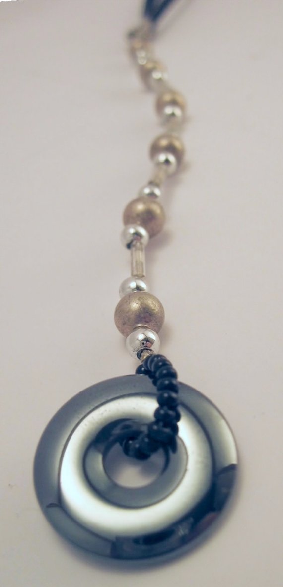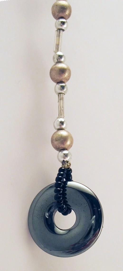 Rear view Mirror Decor – Silver and black glass and metal beads with a shiny little hematite doughnut!