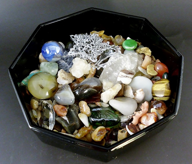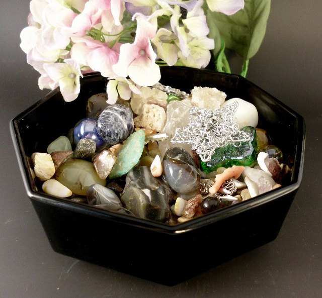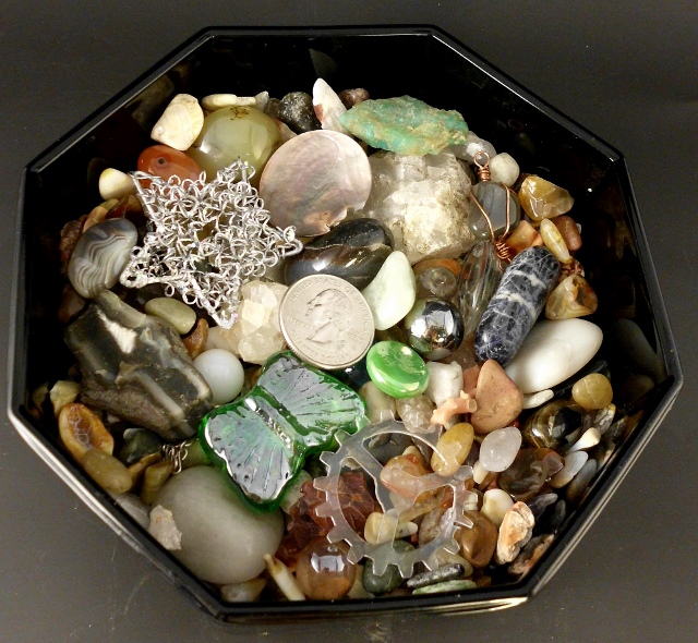 This listing is for my vintage Arcoroc black glass octagonal treasure bowl. It is approximately 5 1/2" across by 2" deep and contains things such as Sodalite, Agate, Fluorite, Quartz, marbles, metal trinkets, etc. Enjoy exploring the wondrous treasures!