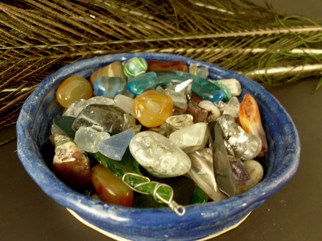 This listing is for my blue coil ceramic treasure bowl. It is approximately 5" X 1 1/4" and contains things such as Obsidian, agatized wood, glass, amethyst, agate, quartz, amazonite, etc. Enjoy exploring the wondrous treasures!
