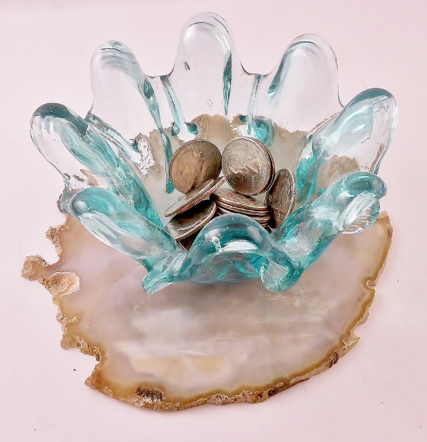 Here I have for sale a vintage handmade Italian Glass Pinch Bowl from the 1950's - 60's in a very rare and hard to find pretty light blue! I have attached this beautiful and versatile bowl to an awesome slice of brown and white polished agate. It measures approximately 6 1/2" across the stone bottom, 2 7/8" tall and 4 1/2" across the top of the bowl and could be used for just about anything - a candy dish, flower bowl, catch-all, candle holder, incense burner, ashtray, pipe holder, etc.