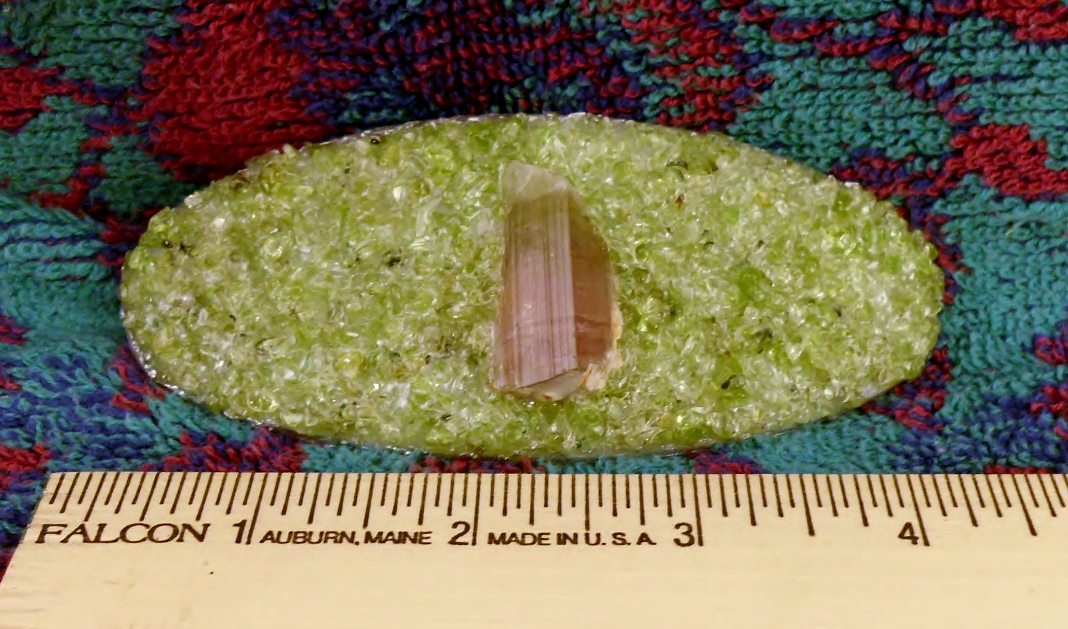This lovely authentic Watermelon Tourmaline and Peridot large hair clip is oval and measures approximately 4 1/2" X 2" with a 3" clip. It may appear heavy but this clip is very strong and holds just fine!
